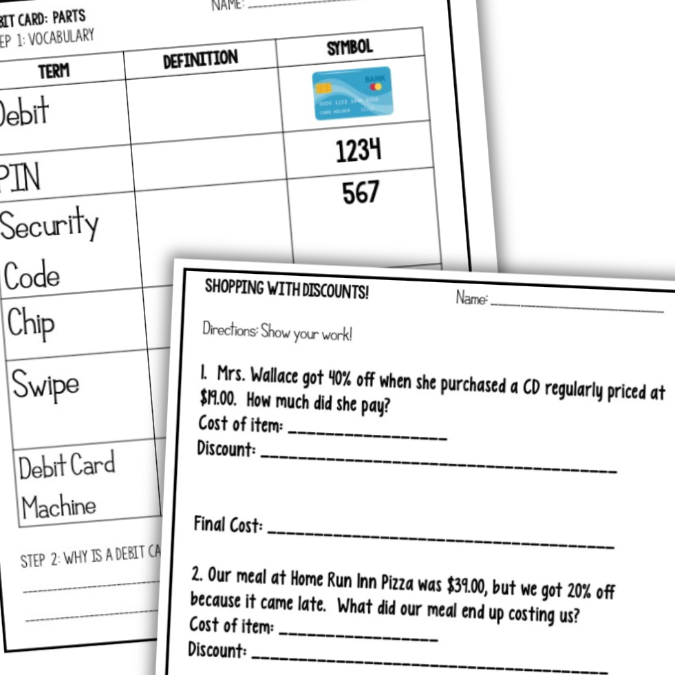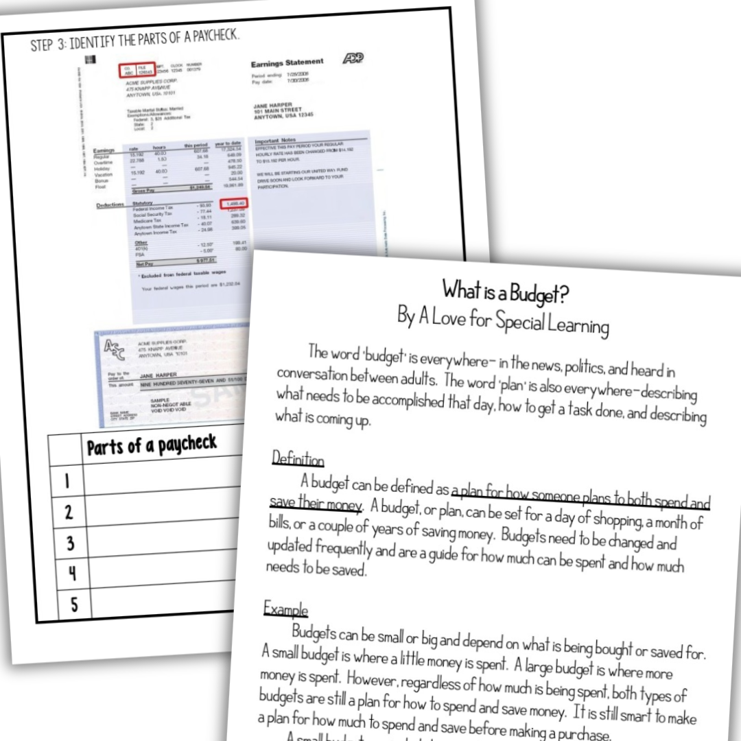 Including: Income, Banking, Budgeting, Money Safety, Saving, Shopping, Ordering/Tipping, Financial Advocacy, Time, and Vocational Math